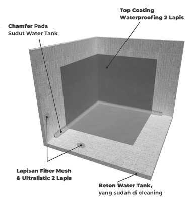 Waterproofing adalah proses aplikasi lapisan pelindung pada permukaan konstruksi untuk mencegah penetrasi air. Pada water tank, yaitu tangki air yang digunakan untuk menyimpan air bersih atau limbah, waterproofing sangat penting untuk menjaga kualitas air yang disimpan, melindungi struktur tangki, dan mencegah kebocoran yang dapat menyebabkan kerusakan pada bangunan dan lingkungan sekitar.