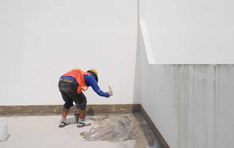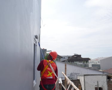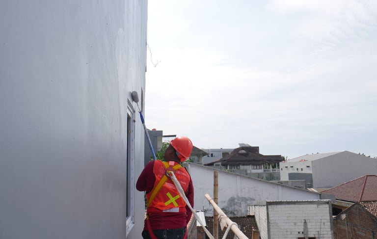 Waterproofing Dinding Luar berfungsi melindungi permukaan eksterior bangunan dari rembesan air hujan dan kelembapan. Metode ini melibatkan penggunaan pelapis anti air atau membran yang mencegah air masuk melalui retakan atau pori-pori dinding. Waterproofing dinding luar penting untuk menjaga struktur tetap kering, mencegah lumut, jamur, serta kerusakan dinding akibat air, sehingga memperpanjang umur bangunan.